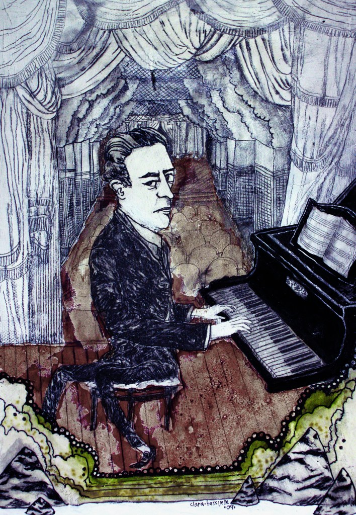 The pianist, painting made on a canvas with plaster, coffee and graphite. from 2009